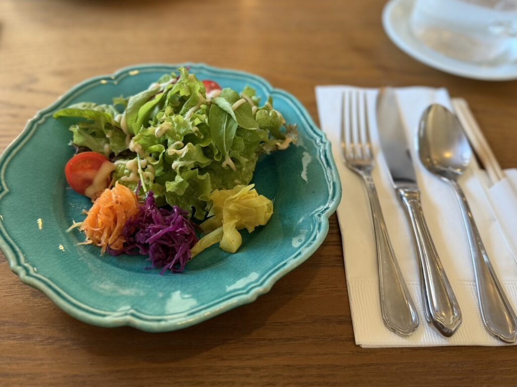 まず運ばれてきた前菜のサラダは、彩りが美しく、見た目から気分が上がります。丁寧に仕立てられていて、味ももちろん満足度の高い一皿。