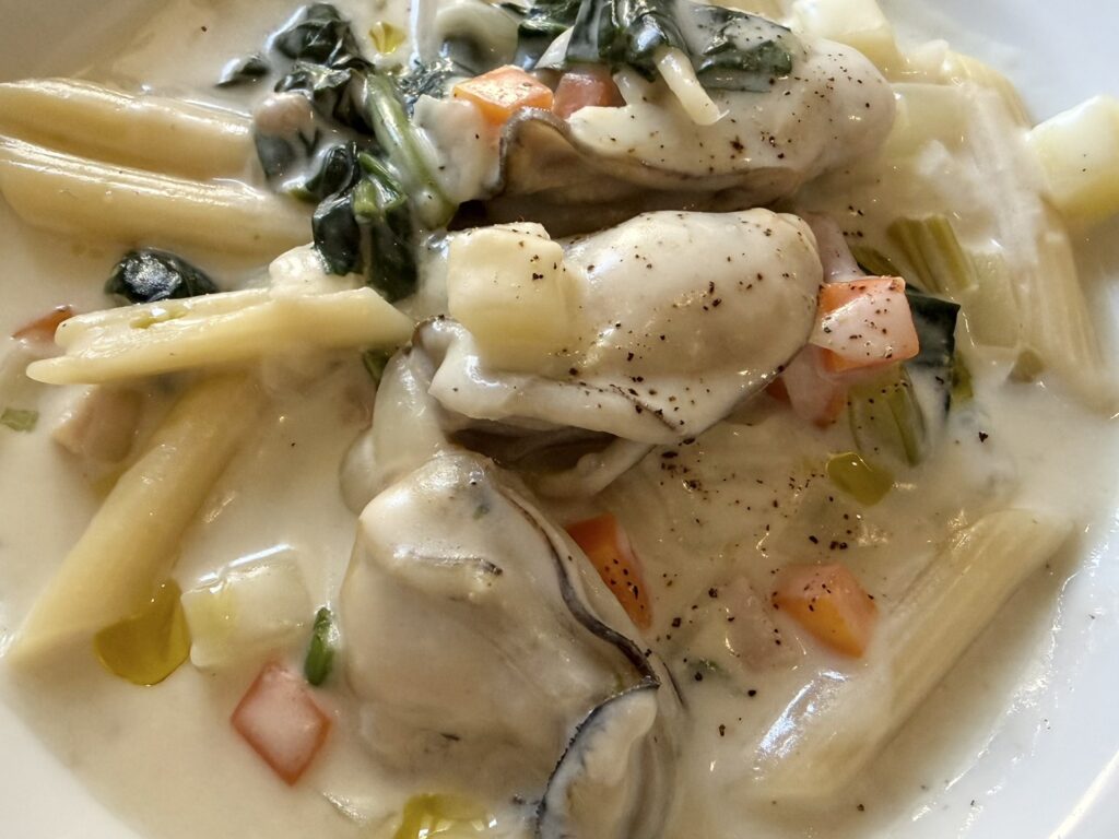 メインのクラムチャウダーには、存在感のある牡蠣がたっぷり。加熱すると縮んでしまいがちな牡蠣ですが、こちらは驚くほどぷりぷり。