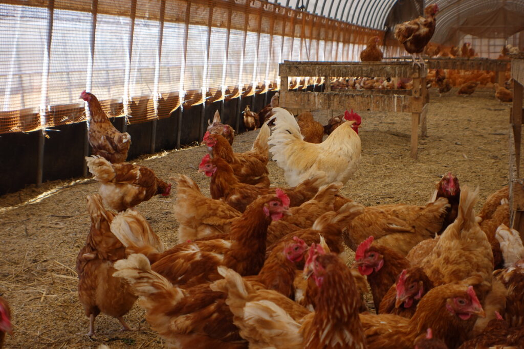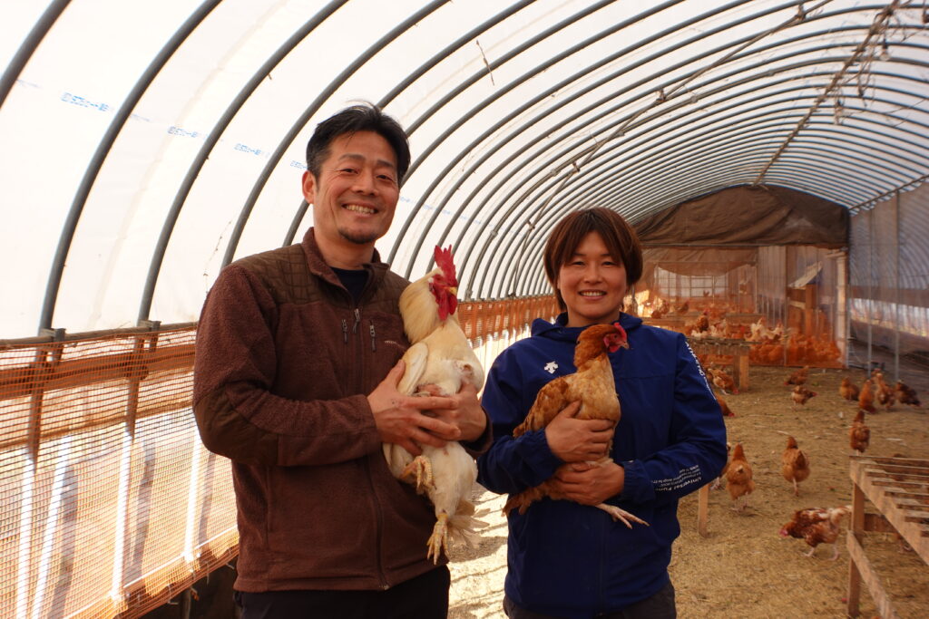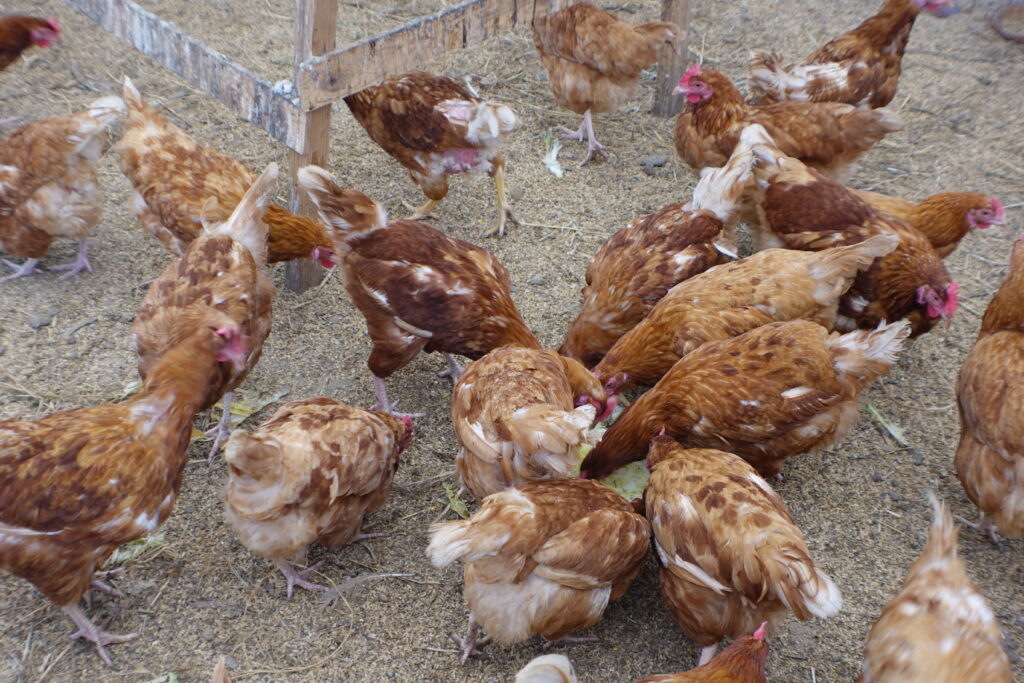 訪れた鶏舎では、つやつやの羽をした鶏たちが元気に歩き回り、外と中を行き来する姿に癒されました。鶏たちが食べる野菜はほとんど自家栽培で、海から海藻をとってきて餌にすることもあるそうです。