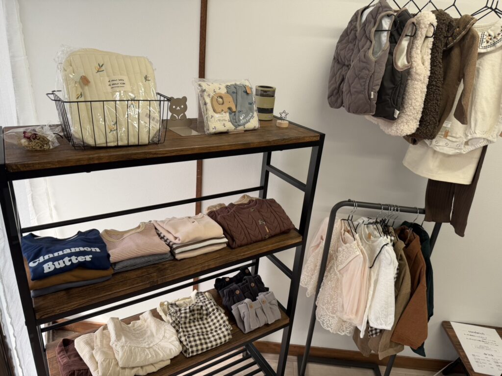 さらに、店内には店主さんセレクトのベビー・キッズ服も販売されています。サイズは60〜110センチほどで、シンプルながらもお洒落なデザインが揃っており、贈り物にも喜ばれそう。