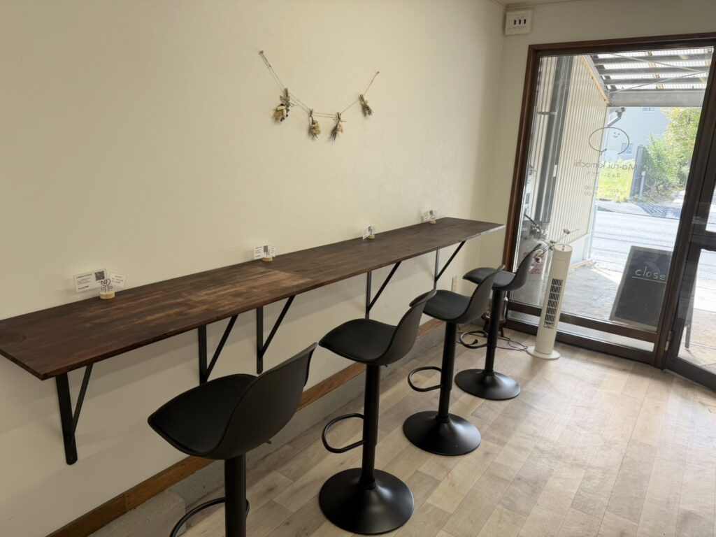 店内にはカウンター席が4席とソファー席がひとつ。テイクアウトはもちろんイートインもできるので、買い物やお出かけの合間にふらりと立ち寄るのもおすすめ。駐車場は店舗前と店舗横にあり、車でもアクセスしやすい立地です。