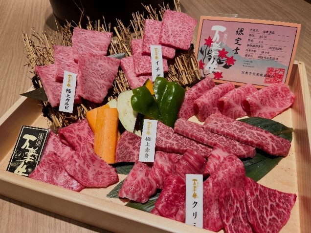 おすすめのメニューは、贅沢にうにをのせた「万葉牛うにく」(1,290円)と、「万葉牛7種盛り合わせ」(6,990円)。その日のおすすめ部位を集めた盛り合わせでは、万葉牛の魅力を余すことなく堪能できます。万葉牛は、きめ細やかで美しい霜降りと、とろけるような舌ざわりが魅力。脂の甘みが広がりながらもしつこくなく、上品であっさりとした後味が楽しめます。