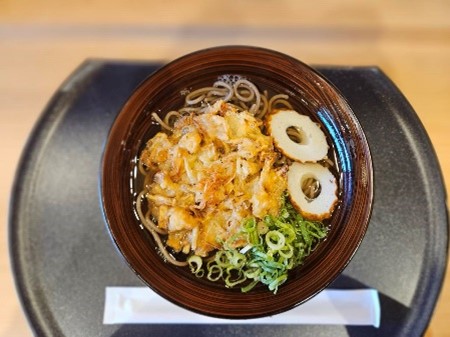 看板メニューの「砂丘そば」をはじめ、リーニューアルに合わせて新たなセットメニューが加わり、約40品を提供しています。日高の昆布と四国のけずり節に、地元の醬油を合わせた出汁が美味。お客さんから「出汁を分けてほしい」と言われることもあり、ファンが多い老舗です。物価高の中でも価格にこだわり、あごちくわとネギを添えた「砂丘そば」は1杯530円(税込)。今回はトッピングを追加。かき揚げに出汁がしみて、口の中に旨味が広がります。