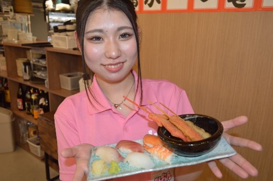 「ニュー山ちゃん」は、名物の串カツとお寿司を中心に豊富なメニューをそろえる大阪屋台スタイルの居酒屋です。広々とした明るい店内で、元気いっぱいの店員さん達が出迎えてくれ、平日の昼間から賑わいます。看板メニューの「ニュー山ちゃん名物盛り合わせ」(1,100円) はお得に串カツとお寿司が同時に味わえます。