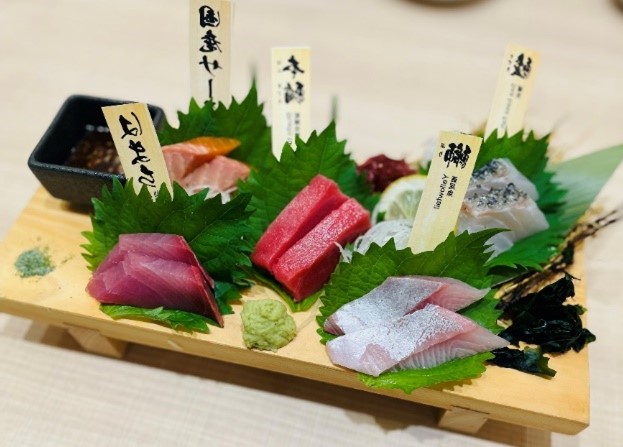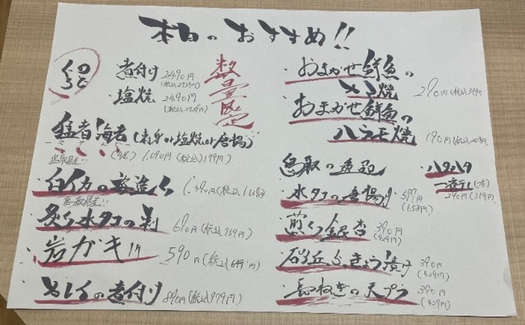 お店のおすすめは「本まぐろ入り刺身5点盛り合わせ」。3貫盛り2,528円、2貫盛り1,758円です。どれも厚みがあり、食べ応え抜群です!特に本まぐろは脂のりが絶妙で、まろやかな甘みが後を引くおいしさです。ごまだれ・醤油・あおさの3種類のタレがあり、それぞれのタレが魚の旨味を引き立てます。さらに「本日のおすすめ」では、その日一番の食材をお得な価格で提供しています。料理だけでなく、スタッフの明るい接客も魅力で、「訪れたお客さんに笑顔で帰っていただきたい」という思いが伝わってきます。旅の締めくくりにも、仕事帰りの一杯にもぴったりなお店です。