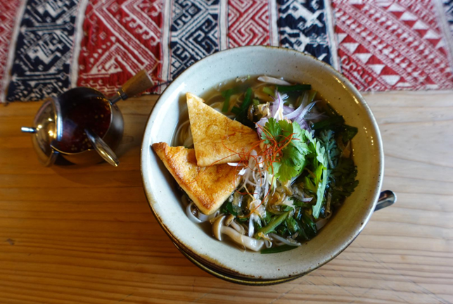 今回は、ベジタリアンのお客さんにもおすすめの、油揚げがのっているキツネフォーをいただきました。店主さんがこだわって一から作っているという牛骨の出汁は、牛骨の旨味と後からやってくる野菜やスパイスの香りが美味!