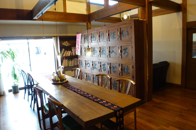 優しいブルーの暖簾が目印のお店。どこか懐かしい気持ちになる広々とした玄関を上がり、店内に入ります。 開放的な大きなテーブル席と個室のような席を隔てているのは、大きな木製ロッカー。昭和初期から銭湯を営んでいたという、店主さんのお祖父さんのお家をリノベーションし、お店にした名残だそうです。