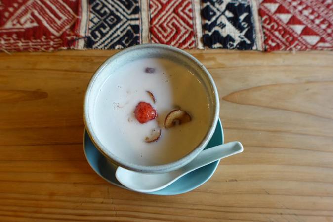食後に頂いたのは、ベトナムのぜんざい的存在である「チェー」。ココナッツミルクベースの甘いスープに、小豆や蓮の実、梨の甘煮などが入っています。これから寒くなる季節に、食べてほっこり心が緩むデザートです。