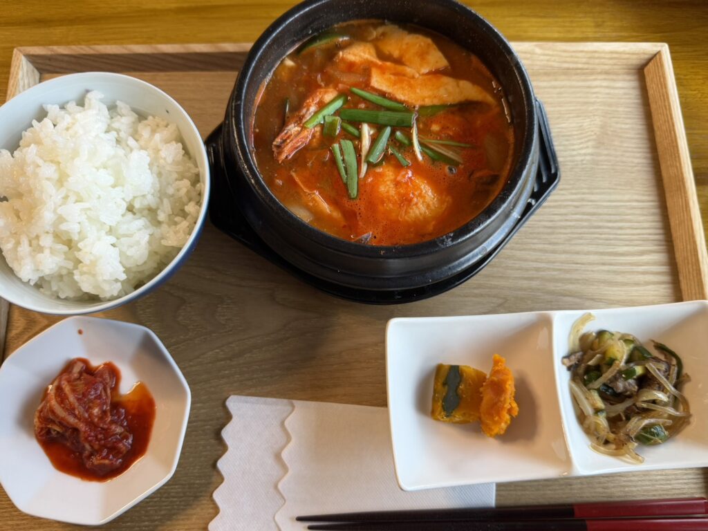 今回いただいたのは海鮮スンドゥブチゲ。鍋はぐつぐつと煮立ちながら運ばれ、動画でお伝えできないのがもったいないほど。
