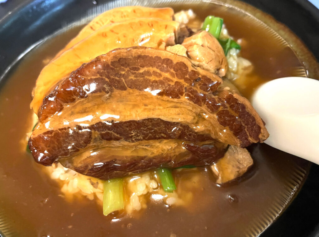常連さんの間で人気なのが、豚角煮丼。丼いっぱいに盛られた角煮は、箸を入れるとほろりと崩れる柔らかさ。甘めのあんがご飯に染み込み、ボリュームも満点です。じっくり煮込まれた豚のうまみが口いっぱいに広がり、「この一品を目当てに通う」というファンも多いそう。満足感たっぷりの看板メニューです。