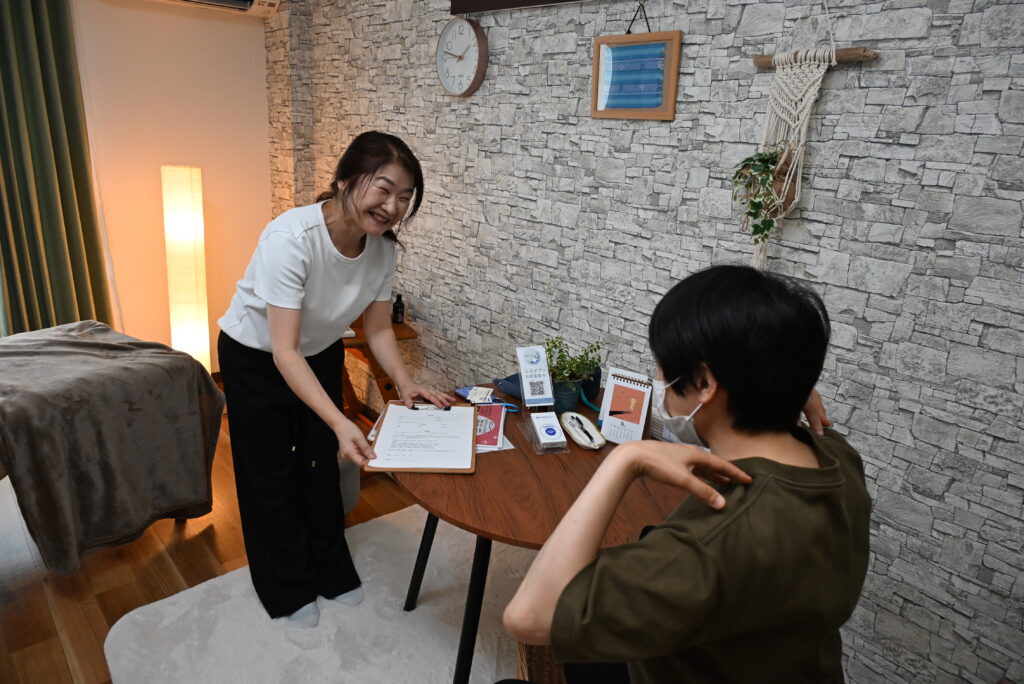 リラクゼーションまどろーむの下田オーナーの「気になるところはありますか?」などの質問に答えることは、自分の体と向き合う大切な時間です。スタッフの悩みは、肩こり。仕事でパソコンと長時間向き合うこともあり、スマホを使う時間も多くなりがちです。体の気になることを丁寧に聞き取ってもらったら、施術が始まります。