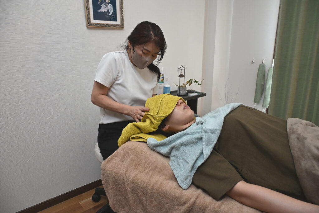 ベッドに仰向けになり、顔と胸周りにタオルをかけます。いつもは照明を落として施術されるそうですが、今回は取材のため明るい空間で施術いただきました。ゆったりとした癒やしの曲をBGMに施術が始まります。