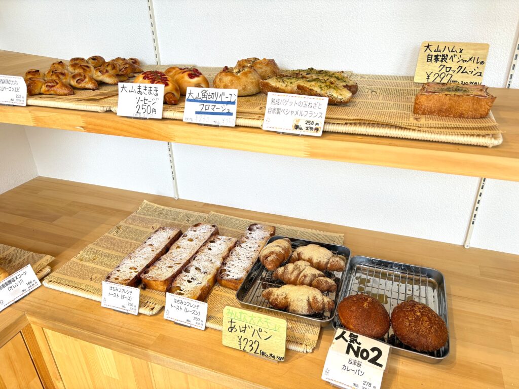 「塩バターパン」はじゅわっと広がる塩味とバターのコクが絶妙。「大山バター香るクロワッサン」は層が美しく、サクッと軽やか。取材時には「ブリオッシュメロンパン」が早々に売り切れるなど、その人気ぶりがうかがえました。どれも、訪れる人に愛されている人気のパンです。