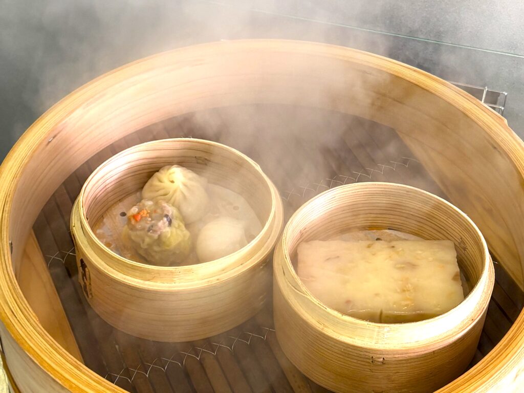 取材時には、大きなせいろの蓋を開けると、湯気とともに現れる蒸したての点心を見ることができました。