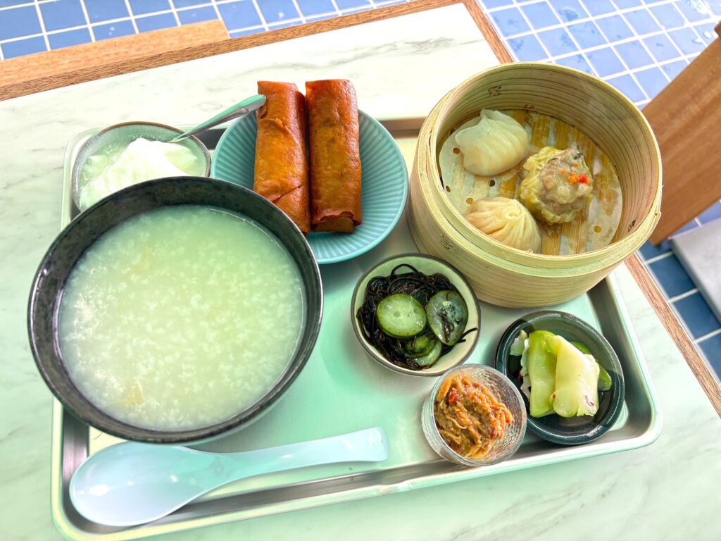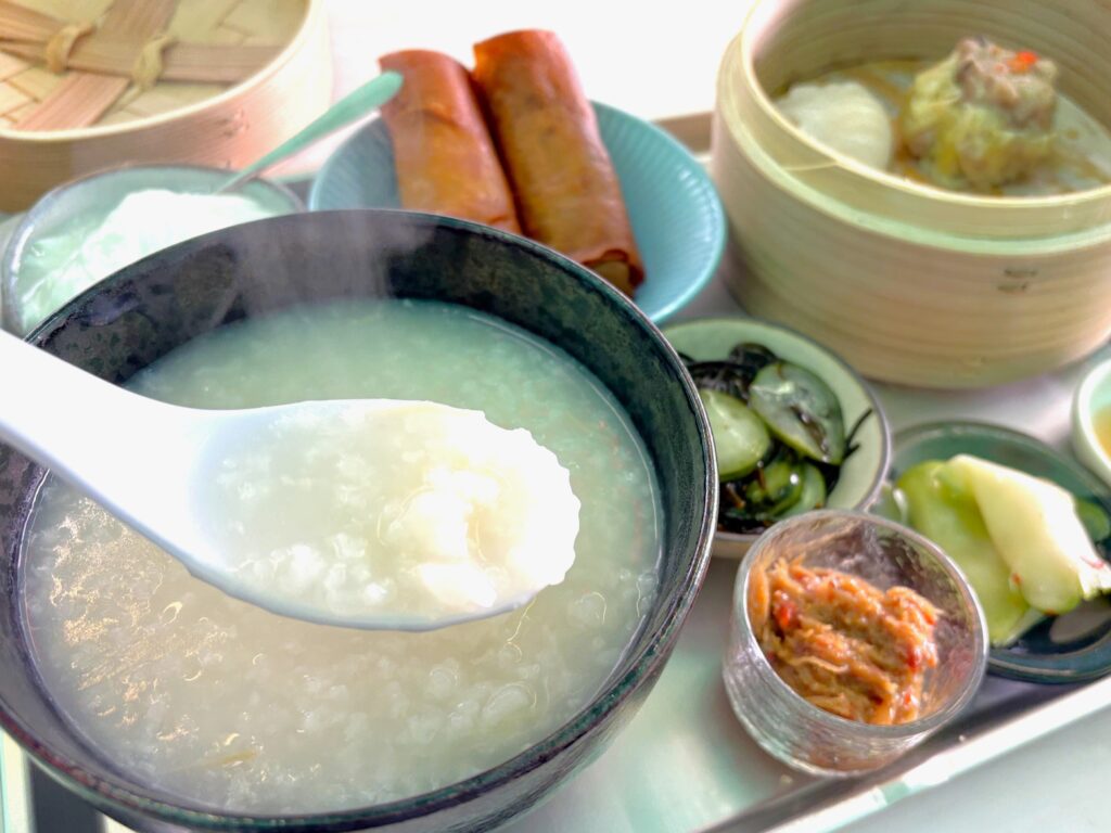 中華粥は、貝柱のだしがしっかり効いたやさしい味わい。「ザーサイ」や「季節の小鉢」と合わせることで、味に変化をつけながら最後まで楽しめます。この日の小鉢は、太くシャキシャキとした食感が魅力の鳥取県産「鬼もずくの酢和え」と、松葉蟹の旨味がぎゅっと詰まった「松葉蟹の味噌煮」。地元の人でもなかなか味わえない郷土の味が添えられているほか、温かい烏龍茶やジャスミンティー、マンゴープリンまたは杏仁豆腐まで楽しめる充実した内容も魅力です。