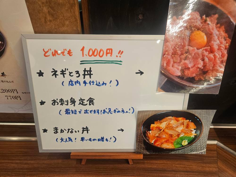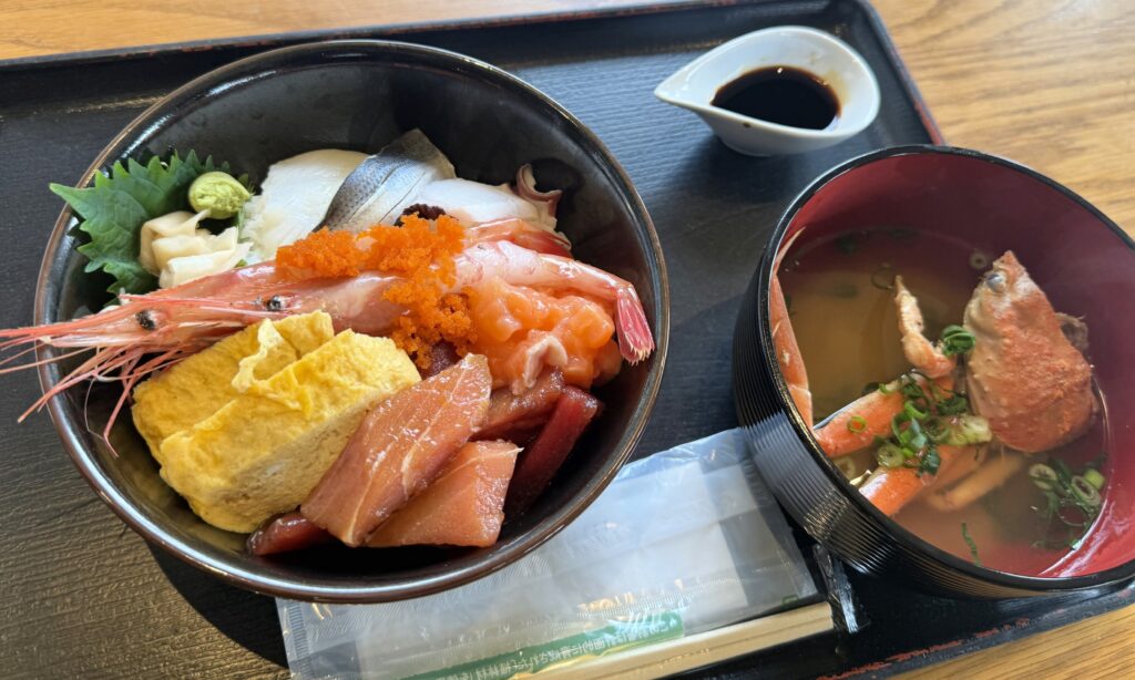 看板メニューの「元氣丼」は、山陰産エビをはじめ、複数の魚介をたっぷり盛り込んだ満足度の高い一杯。鮮度の良さと華やかな見た目に加え、約1,500円前後という利用しやすい価格が魅力です。さらにランチ帯には、サラリーマンでも普段使いしやすい1,000円メニューを3種類用意するなど、幅広い選択肢が用意されています。