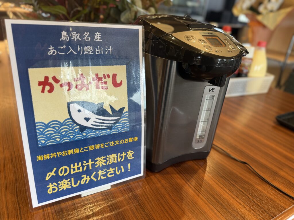 さらに、食事の締めには、鳥取名産の「あご入り鰹出汁」で楽しむだし茶漬けも用意。旨みが広がる出汁が海鮮とよく合い、最後まで満足感のある味わいが広がります。