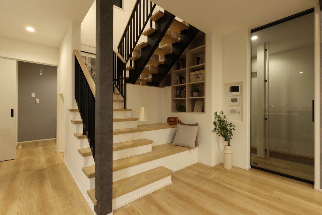 「階段が子どもの秘密基地。遊びも暮らしもひとつになり、笑い声とわくわくがあふれる家」をコンセプトに建てられた二階建て。