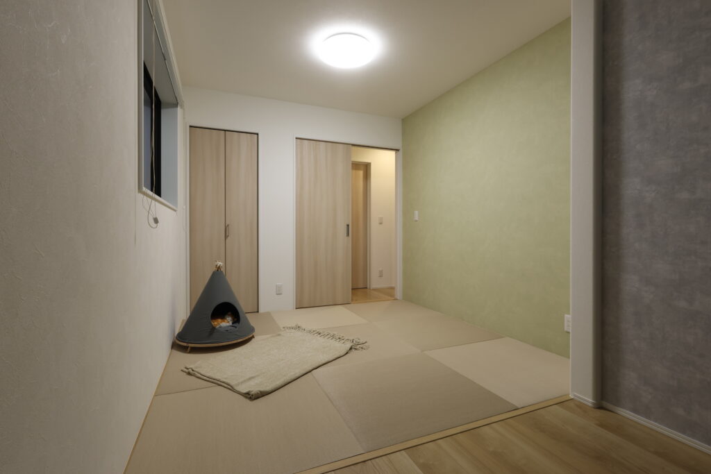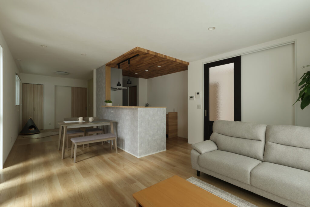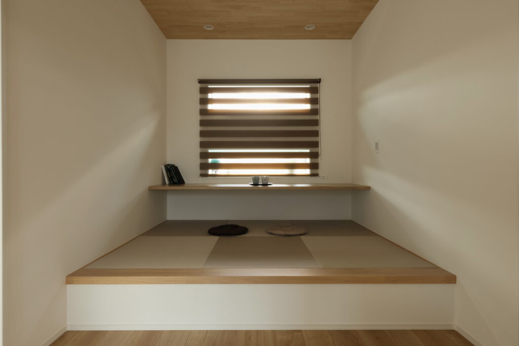 家族が集まるリビングは、開放感と機能性を兼ね備えた空間。キッチンとダイニングが一体になり、料理をしながら会話も弾みそうです。二階には小上がりの畳スペースがあります。窓から光が差し込む落ち着いた空間は、読書や子どもの遊び場、ちょっとしたワークにもぴったり。家族の時間も自分の時間も大切にできる、そんな住まいです。
