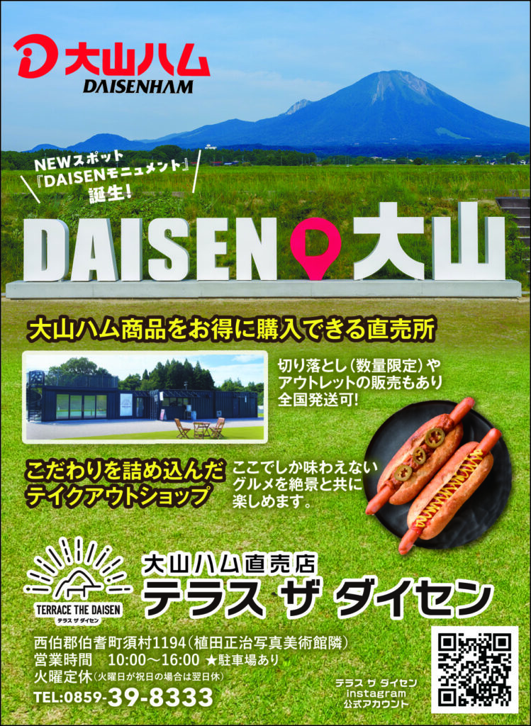 大山ハムの商品がお得に購入できる直売所。ここでしか味わえないテイクアウトグルメも楽しめます。「DAISENモニュメント」も登場し、写真撮影スポットとしても人気。