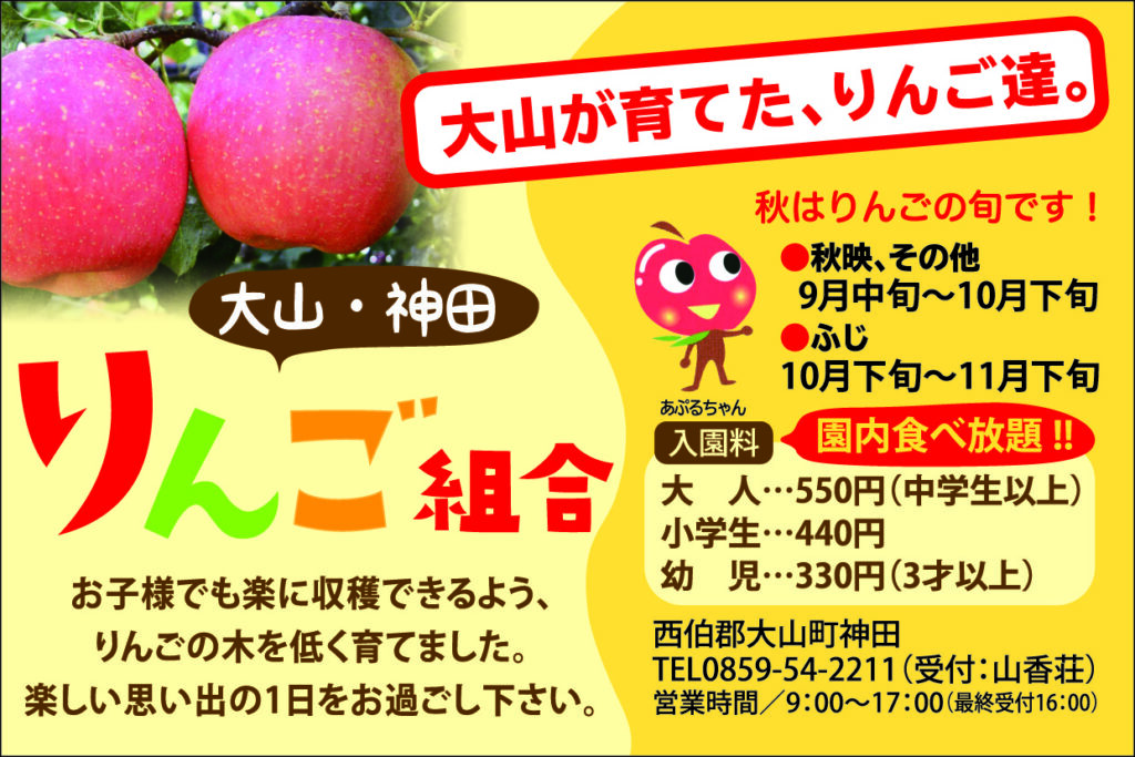 りんごの木を低く育てているので、お子さんも楽に収穫できます。「大山」が育てたおいしいりんごを味わってください。園内食べ放題です!