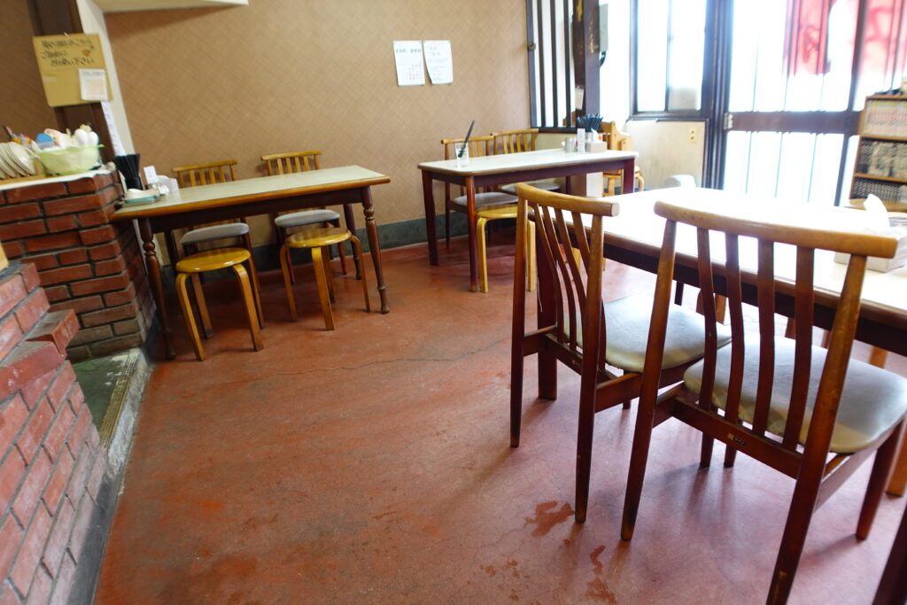 店内はカウンター席とテーブル席があり、頭上に設置されたテレビが懐かしくもあり、アットホームで安心感もあります。