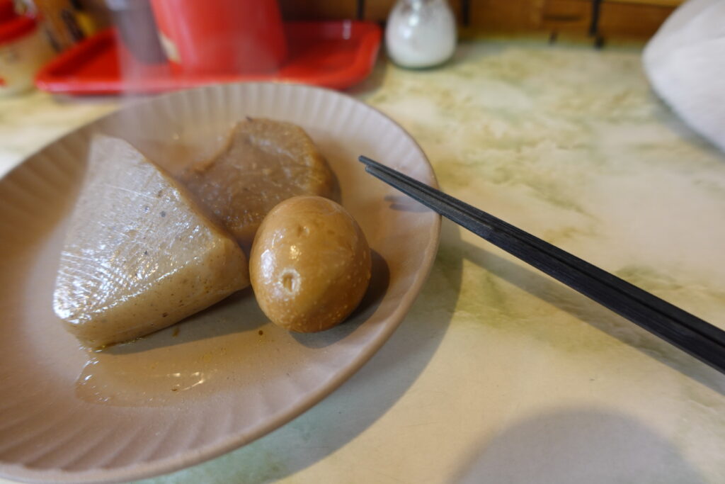 すみれ食堂の代名詞とも言える「牛骨ラーメン」の並を注文し、待っている間におでんコーナーを覗きに行きました。