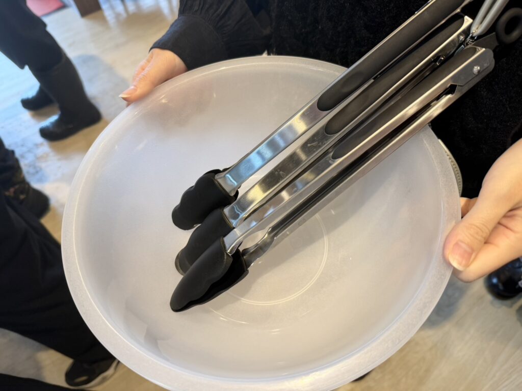 入店すると、まずはスタッフさんが注文方法を説明してくれます。最初にボウルとトングを持ち、好きな主食や団子(つみれ)、野菜などの具材を自由に選んでいくスタイル。