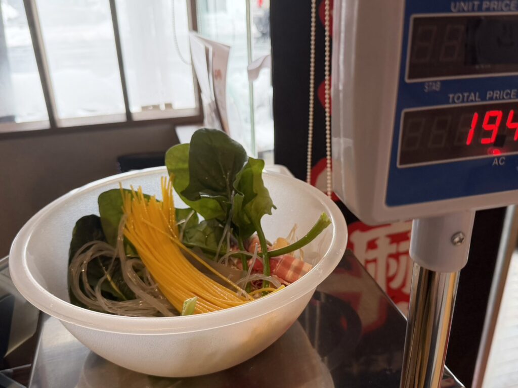選んだ具材は1gあたり4円で計量され、近くに秤があるため、量や価格を確認しながら調整できるのも安心です。見慣れない具材も多く、選ぶ時間そのものが楽しいのが麻辣湯の魅力。麺の種類も豊富で、量や組み合わせを自分好みにできるのはセルフならではです。