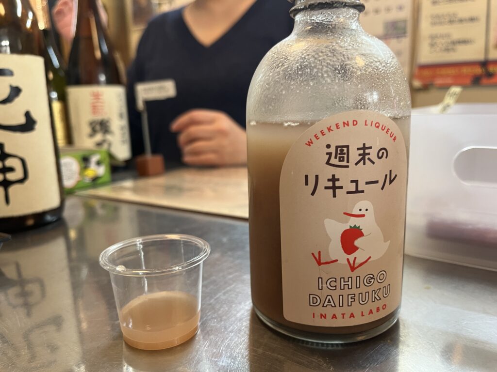 店内には試飲できるお酒も。鳥取・稲田本店のおすすめは週末限定リキュール。苺大福やお芋、あんこを思わせる味わいに驚き、思わず全12種を試飲。味もパッケージも遊び心たっぷりです。