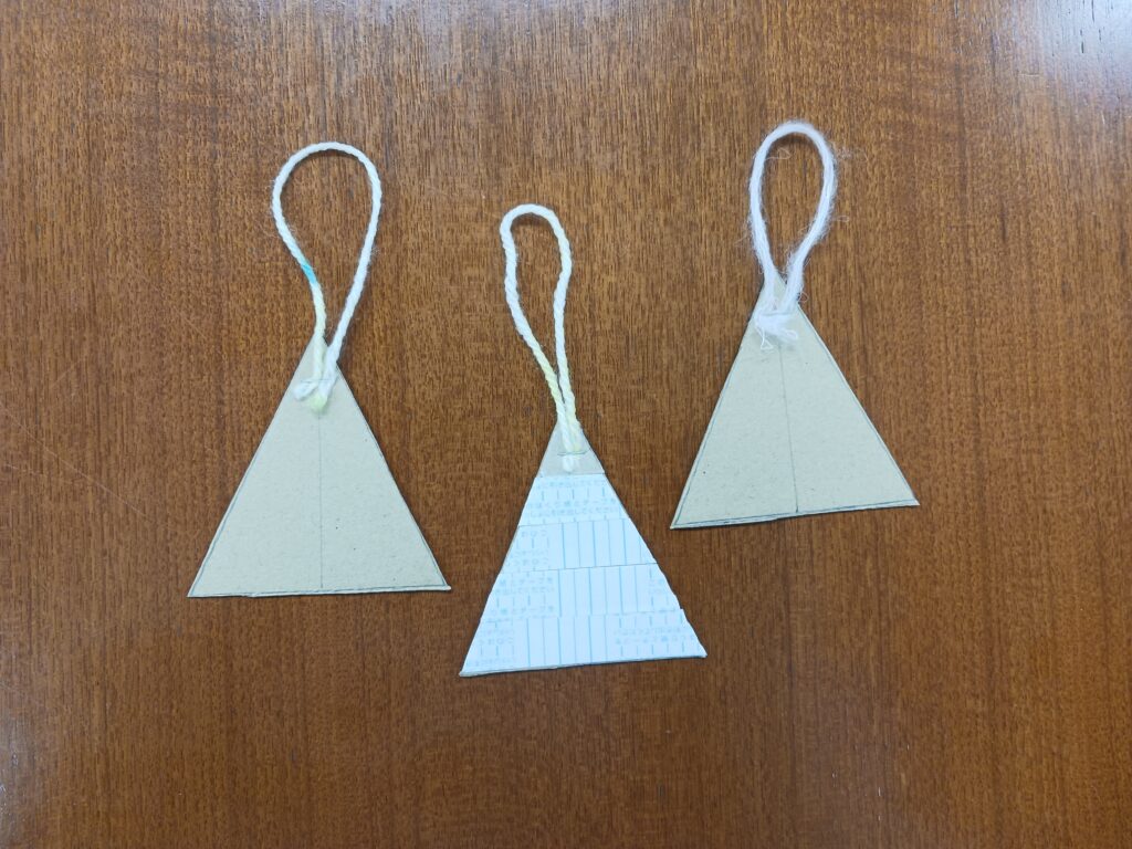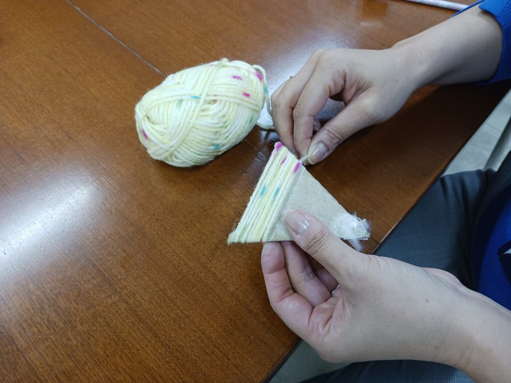 4.両面テープのついた二等辺三角形に丁寧に毛糸を巻き付ける