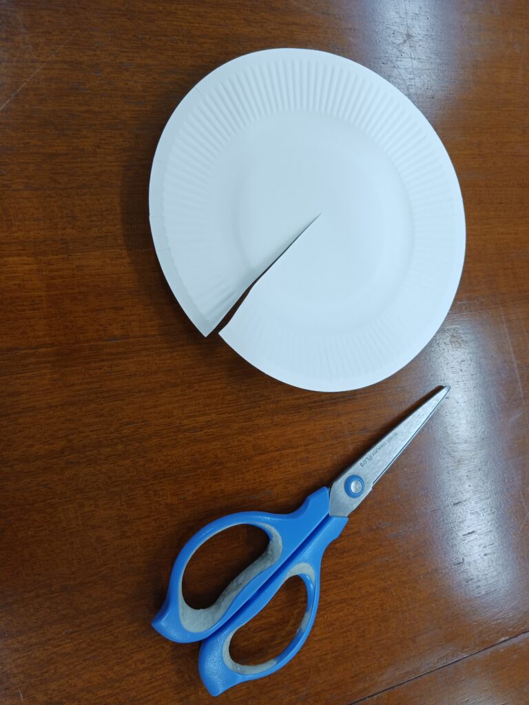 1.紙皿を円の中心に向かって切り込み入れる。切り込みの部分を巻き込み、円すい状の台紙を作る。