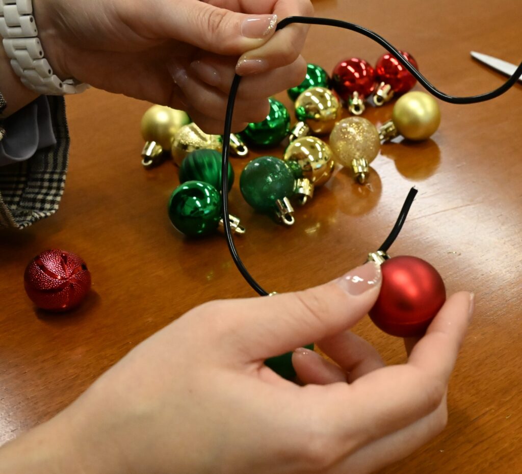 6. ボール型オーナメントがいっぱいになったら、ハンガーを輪にして首の部分でくるっとねじって留める。そして全体の形を整える。